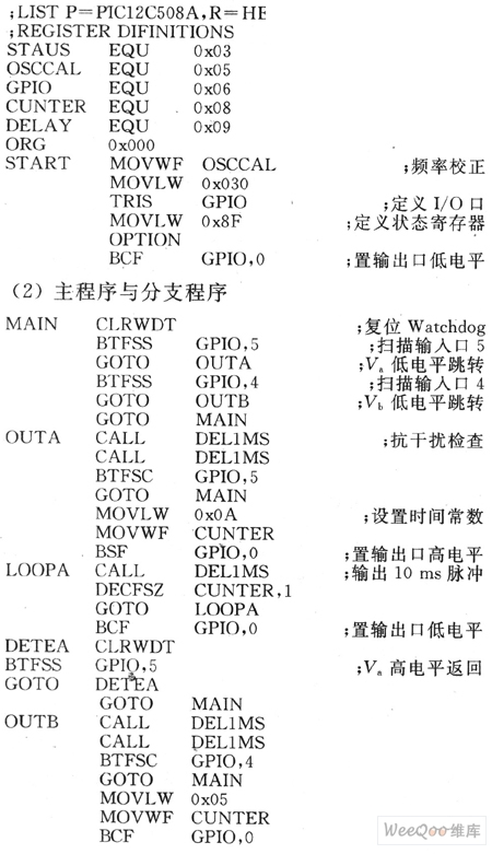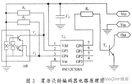 编码器电路的核心采用了Microchip Technology Inc,生产的PIC12C508A微控器。它基于COMS设计,采用RISC结构,片内程序存储器EPROM和数据存储器RAM,集成了上电复位电路 (POR)、时钟振荡器(INTRC)、看门狗定时器(WDT)等功能单元,具有小型化封装(8-Lead SIOC)、低功耗(2)取样轮每旋转一周,软件系统完成一个编码序列转换。编码脉冲低电平宽度由软件决定,与旋转速度无关,而高电平宽度则由磁体N极间隔决定。因此一个完整的编码序列包含了起始点、顺序位置间隔和旋转周期三个方面的信息。