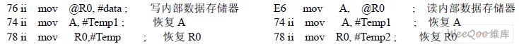 提供了一个时序发生器一个RAM,它包含了一些访问存储器的指令。当一个时序开始的时候,DebugStep信号发送直到时序结束。因此时序指令以全速的处理器速度运行。在微处理器程序输入端设计了一个多路选择器允许时序发生器的指令给内核执行。时序发生器中的指令总是把想访问的存储器和SFRs 中的数据加载到累加器A 中,因此只要把XRAMD0 总线的状态存储到结果储存器中,然后通过JTAG 接口把结果储存器读出就可以得知存储器和SFRs 中的数据。给出一个读内部数据存储器的时序发生器中的程序。其中Temp1,Temp 是时序发生器中定义的存放中间数据的寄存器。