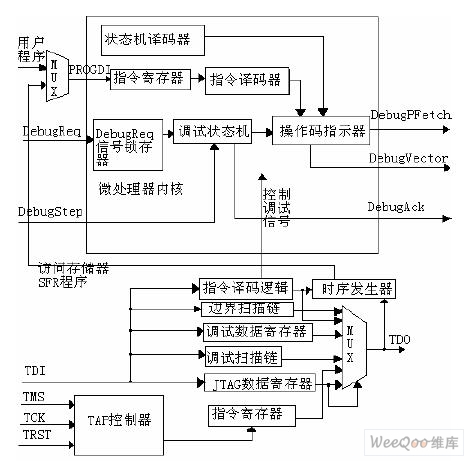 在微处理器内核中设计的调试部分为DebugReq 信号锁存器、调试状态机、操作码指示器。