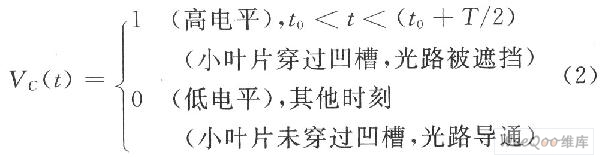 在动片转动的同时,小叶片按同样的频率ω周期,通过光电开关的凹槽,发光二极管的光路被周期切断或通过,使光电三极管处于导通和截止两种状态,因此,在第一个周期T内,同步脉冲信号为Vc(t),其表达式为: