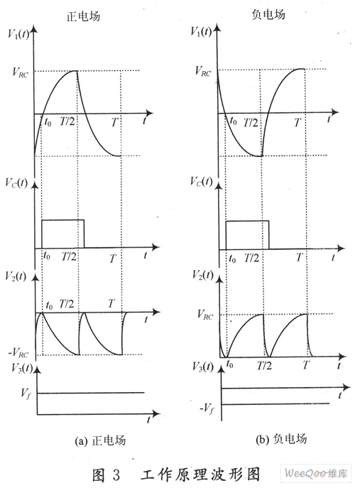 当V1(t)为负半周,VC(t)为低电平时,A点电压为负半周,B点电压为正半周,MC14066BCP中的模拟开关1与开关3断开,模拟开关4导通,则O4引脚输出为V2(t)的负半周,O3引脚输出为高阻状态;当V1(t)为正半周,Vc(t)为高电平时,A点电压为正半周,B点电压为负半周, MC14066BCP中的模拟开关1与开关3导通,模拟开关4断开,则O4引脚输出为高阻状态,O3引脚输出为V2(t)的负半周。在整个信号周期T内,检波输出信号V2(t)始终为负半周,该输出信号经反相滤波器滤波后,得到一正直流电压信号V3(t),因此根据V3(t)的极性,可以得出被测电场为正电场,其工作波形如图3(a)所示。