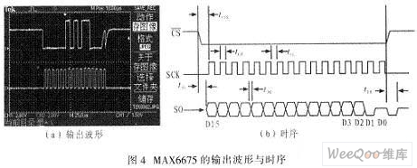 监测温度信号为K型热电偶的输出信号。而热电偶信号调理电路包含有冷端补偿,线性化,放大电路。经过调理后的热电偶信号再送往A/D转换器进行模数转换。据资料显示,这3部分电路的设计及调试,难度过高且所占体积也不小,所以都不是设计首选。因此对热电偶信号的调理及采集采用专用器件MAX6675。MAX6675是Maxim公司生产的带有冷端补偿、线性校正、热电偶断线检测的串行K型热电偶模数转换器,其温度分辨能力为0.25℃,冷端补偿范围为-20℃"十80℃,工作电压为3.0~5.5 V。该器件不仅大大简化电路设计,缩小温度信号处理模块的体积,而且可直接将模拟信号转换成12bit的数字量,而且接口简单,采用SPI串行接口,方便与单片机通信。该器件采用SO-8封装,体积小,可靠性高。图4为单片机控制MAX6675的输出波形及时序。