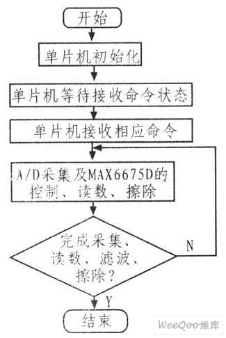使用C8051单片机作为控制器。控制测量信号的采集及与MAX6675的接口,且通过RS-232串口与上位机实现数据交换,上位机通过串口向采集系统发送命令,控制其工作的状态。同时采集系统还带有1 GB的Flash,实现数据的存储功能。该系统的程序流程如图5所示。