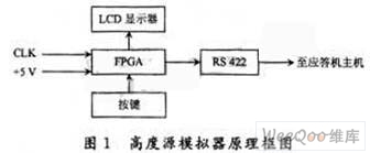 根据高度源模拟器所要实现的功能,可以设计高度源模拟器由FPGA(现场可编程门阵列)、LCD显示器、4个按键、RS 422驱动器、时钟信号、电源等组成。高度源模拟器原理框图如图1所示。