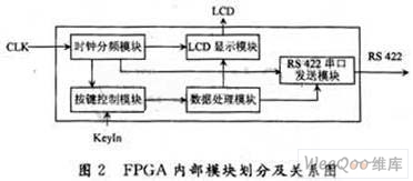 为了便于设计,FPGA内部分为五个模块进行VHDL描述。分别为:时钟分频模块,按键控制模块,LCD显示模块、数据处理模块、RS 422串口数据发送模块。如图2所示。