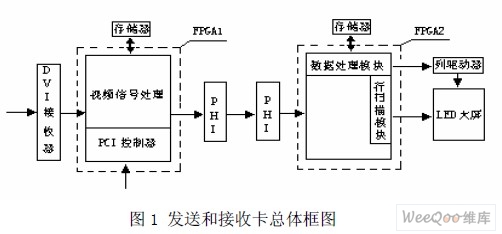 如图 1所示,视频数据通过 DVI 接口传给 FPGA1,进行分辨率的切换和显示区域的选择以及信号的反伽码矫正,通过网络传输给接收卡的 FPGA2,通过 FPGA2 进行数据的缓存,灰度控制以及行扫描和列驱动功能。