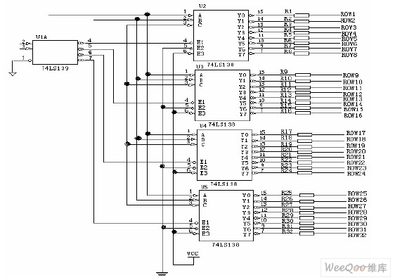 采用行扫描的,必须产生行扫描控制信号。如图 2所示的row[4..0]是行扫描控制信号,用它接一个 2-4 译码器和四个 3-8 译码器来产生 32个行选信号,构成 1/32 扫描方式的显示屏。Hclk为行计数时钟,也可以称为行锁存时钟。