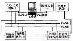 电梯远程监控系统由3部分组成:数据采集卡,视频监控,监控工作站组成,其总体方案结构如图1所示。数据采集卡(图1中的CAN-232数据转换卡)与电梯控制器中负责与监控系统进行数据交换的电梯通讯卡通过CAN总线进行连接,布线方式采用总线式。如果总线长超过100米,那么在总线末端应该接120欧的抑制信号反射的终端电阻。这两个120Ω的电阻,对匹配总线阻抗起着相当重要的作用。忽略掉它们,会使数据通信的抗干扰性和可靠性大大降低,甚至无法通信,这一点在现场已经得到了验证。数据采集卡通过RS232总线连接工作站的COM1口,与工作站进行数据通信。