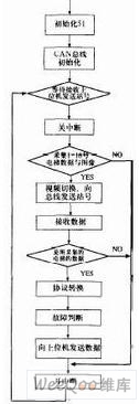 在CAN总线通信中,初始化模块较为重要,是一个重点,也是难点。在初始化时,首先进入复位模式,然后对CAN控制器的寄存器配置。但在实际中发现硬复位较可靠,只要时间足够,一定能使CAN控制器进人复位状态,但此时CAN控制器的某些寄存器的值不确定。软复位正好相反,不一定能使CAN控制器进人复位状态,但一旦进人复位状态则CAN控制器的寄存器数值就为确定的复位值。在实际应用中此两种复位方法结合使用效果好。因此,在硬件电路中还设计了Watchdog电路,它同时还可以防止单片机死机或者程序出现“跑飞”现象发生。初始化程序流程图如图2所示,采集卡整体程序流程图如图3所示。