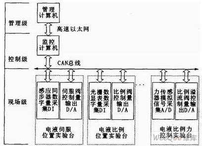 开放式电液伺服控制系统包括数台电液伺服位置控制实验台、电液比例转速控制实验台、电液比例力控制实验台。各实验台配置1套基于CAN总线的智能数据采集模块和内置控制算法的智能控制模块,通过CAN总线将各分散的采集模块和控制模块组成一个控制网络,1台PC机通过内置的CAN适配卡接入局部网络,模拟工业现场的过程控制,PC机作为担任过程控制监控任务的控制站,可以实时显示各实验台工作状况及向各实验台发送启停命令,同时还可以通过高速以太网将现场数据远程传输至工程师站等管理级计算机,实现如图1所示的分层现场总线控制系统。