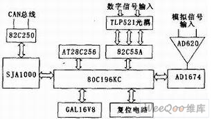 数据采集模块作为一种智能化现场仪表,主要包括硬件系统和控制软件2大部分。模块硬件部分以80C196KC单片机作为采集模块的核心,外围电路主要包括CAN总线接口,程序存储器,电源监控及复位电路,GAL译码电路,DI、A/D转换电路及模块参数设置电路等。模块结构如图2所示。