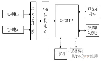 谐波检测系统硬件主要由电压电流采集电路,信号调理电路,模数转换电路,显示及按键电路等组成。系统的处理器采用S3C2410,是一款基于ARM920T内核的RISC嵌入式微处理器。ARM920T核由ARM9TDMI、存储管理单元MMU和高速缓存三部分组成。其中,MMU可以管理虚拟内存,高速缓存由独立的16KB地址和16KB数据高速Cache组成。ARM920T有两个内部协处理器:CP14和CP15。CP14用于调试控制,CP15用于存储系统控制以及测试控制。根据国家对谐波测量仪器的要求,A级测量仪器应分析到50次谐波,根据采样定理的要求,采样频率与被采样信号频谱中最高频率的比值应大于2,因此工频周期采样点数为256时,采样频率为640kHz。S3C2410的主频能达到203MHz完全能够满足采集要求。而且能有一定的时间可以处理显示和按键扫描等。硬件系统框图如图1: