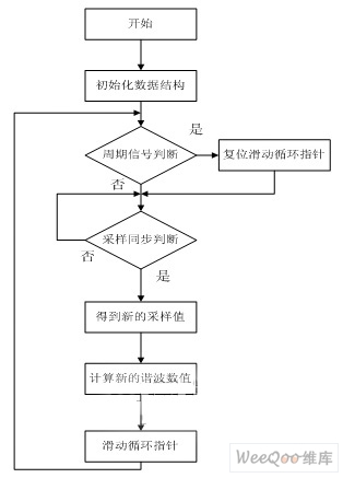 系统的软件分为系统初始化、采样转换、FFT计算、数据统计分析存储、时钟读写、人机交互以及和上位机的通信等几个模块。滑窗迭代DFT检测方法实现流程图如图4所示。