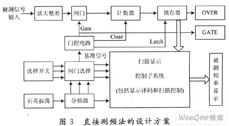 直接测频法就是在一定的时间间隔T内,也就是所谓的闸门时间内测得输入周期信号重复变换的次数N,于是根据频率与周期的关系,被测信号的频率可以表示为: