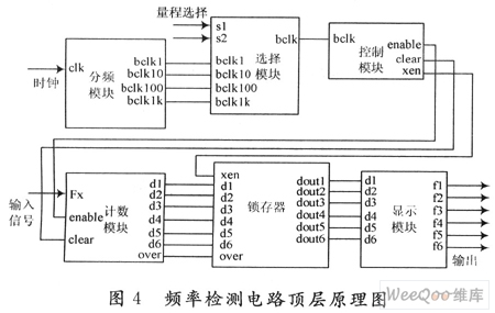 在设计中,通过两位量程选择开关的控制,对时钟信号进行分频,可以得到1 s,100 ms,10 ms和1 ms四个不同的闸门开通时间。同时,计数部分采用六位十进制计数,于是可以得到0.1~100 MHz四个频率检测量程。