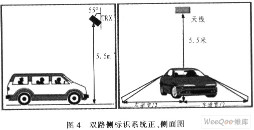多路径路测标识采用广播发射式,安装在产生多路径交叉口路测,根据车辆来往方向向电子标签中写入车辆的行驶路径记录,具体参数与车道路测标识单元一致。图4给出双路侧标识系统图。