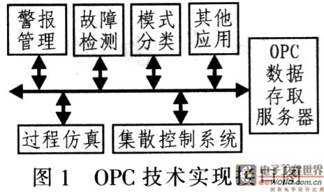 OPC是为使不同供应厂商的设备和应用程序之间的软件接口标准化,以及使其问的数据交换更加简单化而提出的。作为结果可向用户提供不依赖于特定开发语言和开发环境的可以自由组合使用的过程控制软件组件产品。利用OPC的系统由按照应用程序(客户程序)的要求提供数据采集服务的OPC服务器、使用OPC服务器所必需的OPC接口,以及接受服务的OPC应用程序所构成。OPC服务器按照各供应厂商的硬件所开发,因此可以吸收各供应厂商硬件和系统的差异,从而实现不依赖于硬件的系统构成。同时利用一种叫做Variant的数据类型,可以不依赖于硬件中同有的数据类型,按照应用程序的要求提供数据格式。利用OPC 使接口标准化可以构成如图2所示的系统。OPC典型体系结构如图3所示。
