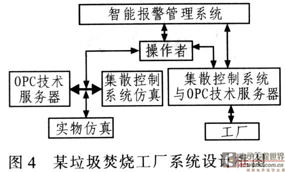 OPC因其特点和优越性已在工业控制领域中得到广泛应用。通常使用OPC技术进行工业过程控制中采集数据。OPC数据订阅和数据动态绑定,为具有数据绑定功能所有ActiveX控件提供数据源,用户可方便地观察来自OPC服务器实时数据。图4是一个OPC垃圾焚烧系统中应用实例。该系统分为生产管理监控级和现场控制级两层结构。