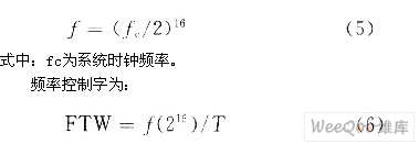 DDS的主要参数包括:系统时钟频率、频率控制字长、频率分辨率、ROM单元数、ROM字长。该设计的DDS是10位的,时钟频率为转化为VHDL文件后的输入时钟频率。这是一个很灵活的输入频率。在此,假设输入频率为fin,频率控制字长为16位,ROM单元数为210,ROM字长为9位,而且频率分辨率为: