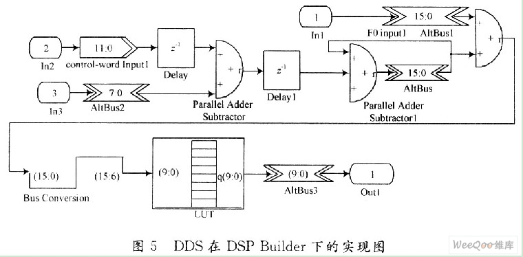 第一个并行累加器模块(Parallel Adder Su^rac-tor)作为相位累加器,采用Altera提供的总线结构(AltBus)模块决定了该累加器的长度为16位,即该累加器最大可输出范围为216,由此决定了公式(5)。
