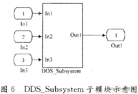 利用总线位宽转换模块(Bus Conversion)只取出总线信号的高10位,用作驱动数据查找表模块的地址驱动信号。为了方便下一步设计,将图5封装成子系统模块(Subsystem Block),并命名为:DDS_Subsystem,如图6所示。