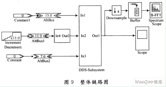 DSP Builder是Ahera公司提供的一个系统级(或算法级)设计工具。它架构在多个软件工具之上,并把系统级(算法仿真建模)和RTL级(硬件实现)两个设计领域的设计工具连接起来,最大程度地发挥了两种工具的优势。DSP Builder可以帮助设计者完成基于FP-GA的DSP设计。除了图形化的系统建模外,DSPBuilder还可以自动完成大部分的设计过程和仿真,直到把设计文件下载至DSP开发板上。该设计采用DSPBuilder开发工具,首先实现输出频率变化可控的直接数字合成(DDS)模块;然后根据Chirp函数的变化规律,控制DDS的输出频率变化规律。