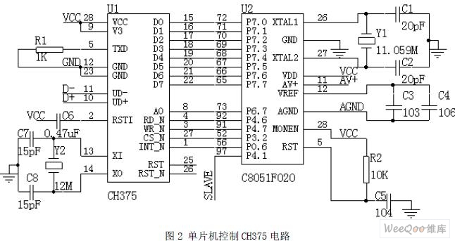本系统使用 C8051F020单片机作为处理器。C8051F020是Cygnal 公司推出的一种 SOC型 8位单片机,片内有 64KB FLASH存储器和4KB RAM,完全符合作为主机时读写 U盘的要求。C8051F020单片机控制 CH375的电路如图 2所示。