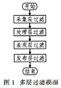 为保证告警过滤的正确性、有效性和灵活性,系统采用多层过滤机制。图1给出多层过滤模型。其中,采集层的过滤策略主要是抑制和忽略。它依据设定的过滤规则,对原始告警数据实施预过滤,屏蔽无用或无需关心的告警数据,以减轻数据处理负荷。处理层过滤是整个过滤机制中的重点。主要用于建立高度收敛的告警过滤模型。其基本流程是:原始告警数据经过采集层过滤后开始分流,并进行延时、闭值、归并、压缩等处理.以对滤掉不关心的告警数据。过滤策略是可修正的,经过修正后的策略进行前转,对此后的告警数据实施新的策略。表现层过滤按照告警属性域设定组合条件,过滤出关心的告警类型。发布层过滤根据设定的过滤规则,从而决定相关信息的发布形式、时间及内容等。