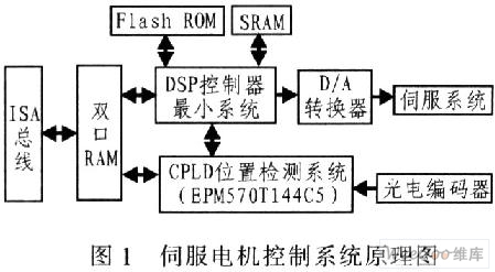 在介绍位置检测系统前,先简要介绍伺服电机控制系统(图1)。CPLD先对伺服电机光电编码器上发出的反馈信号进行译码、四倍频鉴相计数,然后将计数值存入锁存器,当用于电机控制的DSP控制器对CPLD进行读操作时,CPLD将锁存器里的计数值通过三态门输出给DSP控制器,由其控制电机的位移和速度。