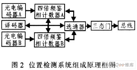 位置检测系统采用CPLD器件实现硬件电路功能,用VHDL语言编程实现译码器、四倍频鉴相计数器、选通器等模块。图2为位置检测系统组成原理图。图2 中,光电编码器A和四倍频鉴相计数器A(光电编码器B和四倍频鉴相计数器B)构成单轴计数电路,将两个单轴计数电路配合译码器、选通器则构成双轴计数电路,就是用译码器控制选通器,以选通两个计数器的计数结果并传输到总线.总线和选通器之间增加三态门进行控制。这样就实现双轴位置检测。