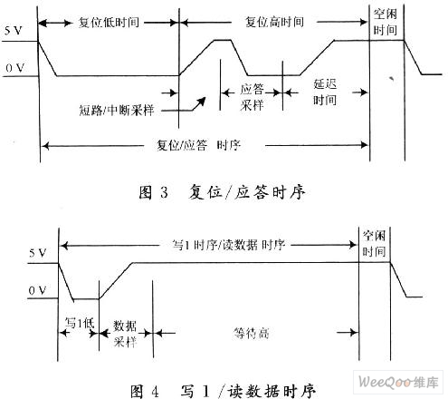 1-Wire通信协议可以通过微处理器上的一个I/O 引脚实现,但是要创建可靠的1-Wire网络,必须提供正确的时序和适当的输出电压摆率,如果1-Wire主机发送的时序不正确会导致与1-Wire从器件之间的通信间断或完全失败,并限制网络的长度。Ds2480B是从串行接口到1-Wire网络协议转换的桥接器。使用这个桥接器和UART连接就能产生严格定时和电压摆率控制的1-Wire波形,并能减轻主机产生1-Wire时序信号和对1-Wire总线进行采样的负担。Ds2480B 接收指令与数据,执行1-Wire操作,并将结果返回至主机。图3为1-Wire复位操作、写1/读数据操作、写 0操作的时序图,这3种操作是1-Wire操作中必须具备的基本操作,几乎所有的其他1-Wire操作都可以由这3种操作构成。由于该设计工作在Flexible模式下,以下提供的参数都是Flexible模式下适用的参数。