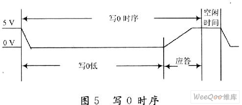 DS2480B的写O时序中先将总线拉低57弘s(写O低)然后释放总线,3~10μs后写0时序结束。如图5所示。