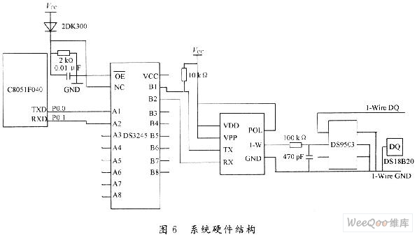 与DS2480B桥接器一起工作的UART应支持8位字长、无奇偶校验、9 600波特率(b/s)的通信方式。该系统采用Silicon公司生产的C8051F040作为主处理器,(;8051F040有2个uART串口,且满足桥接器对UART的要求。温度采集转换芯片为Dallas公司生产的DSl8820。系统原理图如图6所示。