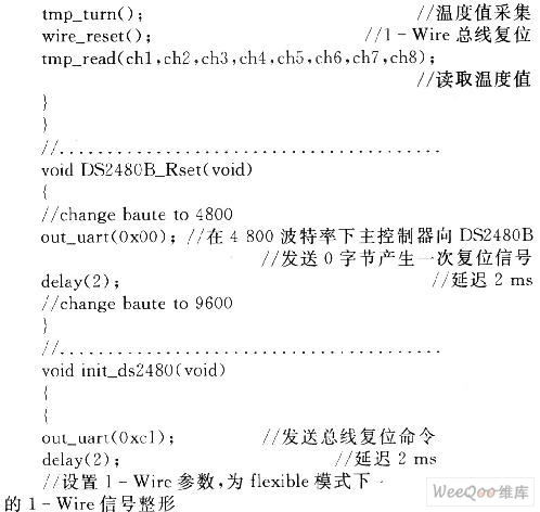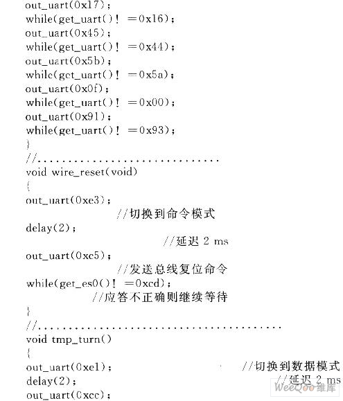 给出的1-Wire总线驱动程序是结合图4所述电路,以C8051F040单片机为主控制器,使用内部时钟频率24.5 MHz编写而成,其中包括DS24.80B复位子程序、DS2480B初始化子程序、总线复位子程序、温度采集子程序、温度值读取子程序。C8051F040系统内部有64 KB FLASH存储器可以用来存储程序代码。C代码设计调试工具为Silicon公司提供的单片机集成开发环境。