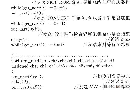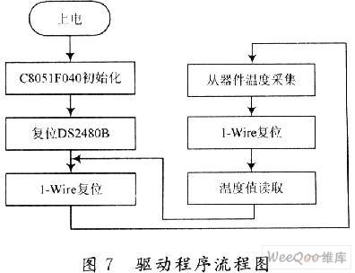 所有的1-Wire操作都是从复位1-Wire总线开始的。每次采集温度值和读取温度值操作前最好对总线进行1次复位操作,同时检测来自总线上的从器件的在线应答脉冲。驱动程序流程图如图7所示,部分程序代码如下所示:
