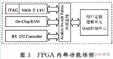 SoPC设计由CPU、存储器接口、标准外设和用户定制逻辑单元模块等组件构成。Altera的SoPCBuilder工具提供了大量IP核可供调用,可以很方便地在单片FPGA芯片上配置嵌入NoisⅡ处理器软核、片上RAM和RS 232控制器、扩展片外存储器、用户定制逻辑单元,同时自动地为系统的每个外设分配地址、连接系统总线,确定设备优先级,其内部结构如图3所示。