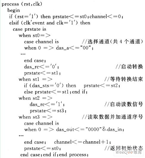 DAS控制单元的有限状态机(FSM)有4个状态,分别为St0,St1,St2,St3。St0为选择通道,启动A/D转换,进入St1状态;St1为等待转换结束,若转换结束,进入St2状态,否则保持在St1状态;St2为发出读数据信号,进入St3状态;St3为输出转换数据;选择其他通道,返回St0状态。DAS控制单元采用VHDL语言进行开发,程序的部分代码如下所示: