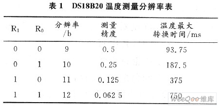 DSl8820温度传感器的内部存储器包括9 B高速暂存RAM和1 B非易失性的可电擦除的E2PROM,后者存放高温度和低温度触发器TH,TL和结构寄存器,该字节第7位(TM)为0,低5位一直都是1,第6,5位(R1,R0)用来设置分辨率,如表1所示。