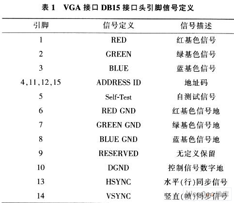 (1)VGA接口引脚表1为15针VGA接口引脚信号的定义列表。