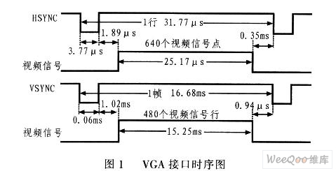 (2)VGA接口时序VGA接口有多种时序,应用时根据具体需要选择不同的时序。图1为640×480在60 Hz模式下的VGA接口时序图。