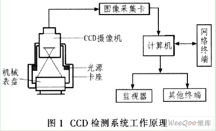 如图1所示,该CCD检测系统主要由CCD摄像机、卡座、光源、图像采集卡,计算机以及输出设备组成。机械表盘和CCD摄像机被卡座固定,卡座内部自带光源,以防止外部环境变化影响图像质量,得到相对稳定的图像,简化计算机处理过程,使软件更加简单可靠。得到的图像通过图像采集卡进行A/D转换.传输到计算机进行软件处理和识别,由计算机对获得的图像进行读数并对采集数据进行检测、监控等工作。