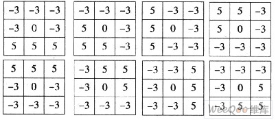 Krisch边缘检测算子使用8个模块来确定梯度幅度值和梯度的方向,即表示为: