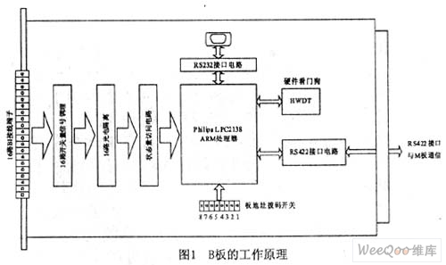 B板以Philips LPC2138 32位ARM微控制器为核心,完成16通道开关量的数据采集。作为嵌入式SCADA系统的一种插件,板上设计了一路RS422异步串行通信接口,通过该接口与装置的通信与管理模板(Communication andManagement Board,简称M板)通信,将采集生成的实时开关量信息上报给M板。由于M板要通过RS422总线管理多块II0板工作,M板采用主从方式实现与II0板的通信连接,为此各IIO板都设计了ID标识地址进行身份确定。B板的ID标识地址采用8位双排跳线器设置,标识地址范围为0lH"FFH。此外,模板还设计了一路为RS232接口,用于模板的检测与调试,以及LPC2138的软件下载。调试RS232接口是一个标准的VTl00超级终端接口,通过该接口可以与PC机进行通信连接,使用Windows的超级终端仿真软件可以十分方便地对该模板进行调试和检测。同时该串口也是LPC2138软件的下载接口,将跳线JPl02和JPl03跳接上,即可通过专用软件将编译连接生成的软件下载到LPC2138的FLASH存储器。