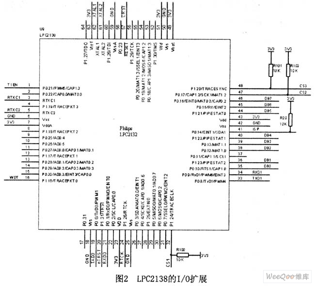 LPC2138是一款总线不出芯片的片上系统(SoC),主要通过I/O引脚对外部电路进行访问。本文设计的B板有16路BI输入状态、8位ID标识地址、异步串口和HWDT等都需要使用I/O资源,LPC2138的I/O引脚不够用。为此,硬件设计时通过对LPC2138的I/0引脚进行组合使用,实现了对外部电路的分时访问。具体实现方法是,采用部分I/O引脚作为CS信号,再用8个I/0模仿8位地址总线DBO"7对外部端口进行访问。这种方法的优点在于既可减少I/0资源的使用,PCB布线也容易许多。采用这种方法进行I/O扩展需要注意两个方面的问题:①由于LPC2138的I/0引脚在启动时多为低状态,此时会导致CS信号都使能,造成冲突,需要将用做CS信号的I/0引脚上拉;②软件访问外部电路时,要通过设置I/O状态模拟外部电路的访问时序。B板LPC2138的I/0扩展如图2所示。