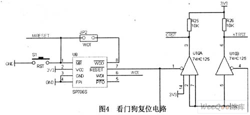 LPC2138的内部本身集成有看门狗电路,但是根据作者多年从事电力系统自动化产品的设计经验,由于CPU内部WDT需要软件编程启动,在极端情况下,系统死机后该WDT不能对系统进行恢复。为此,在进行本模板设计时,没有使用LPC2138内部的WDT,而是采用SP706S芯片专门扩展了一个看门狗,用于系统“走死”后的自动恢复。SP706S是一款专门的看门狗复位电路,其定时器延时的时间为1.6秒。电路设计方法是将SP706S的复位输出引脚与LPC2138复位电路的人工复位引脚相连。由于LPC2138软件下载的时间要大于1.6秒,硬件设计时设置了一个跳线器用于看门狗的使能/禁止,软件下载时将跳线帽拔下,模板正常运行时将跳线帽插上。B板的看门狗复位电路如图4所示。