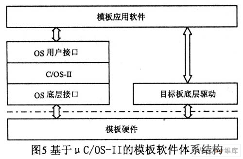 模板软件采用μC/OS—II作为操作系统,软件的层次结构如图5所示。模板的应用软件设计主要工作包括目标板底层驱动程序的编写和模板I/O功能的设计编程两部分工作。