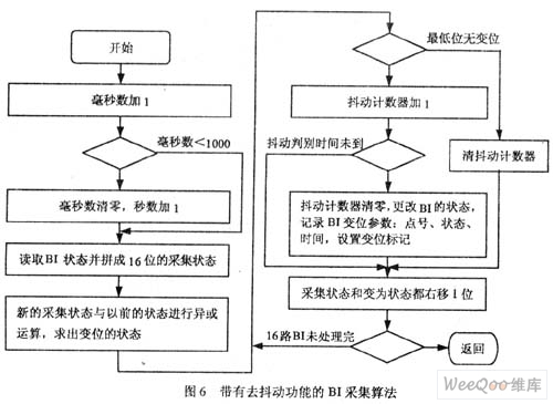 针对工业现场监控对象开关量状态的特性以及干扰抖动的特点,开关量状态大都采用继电器的触点指示,开关量本身从0→1或从l→0的机械变位时间一般都比较长(≥80ms),而干扰抖动的时问非常短(一般为了准确记录开关量变位的时间,通常情况下采用定时中断来扫描读取BI状态,B板的扫描周期为lms,并采用该中断进行SOE时钟的守时,扫描周期为1ms时SOE分辨率可达到2ms。没有去抖动功能常的开关量采集流程为:SOE时钟增长1ms;读取BI的状态;判断开关量是否变位,如果有变位,则记录变位信息,包括BI的点序号、状态、变位时间和变位标记等。为了判别开关量是否发生抖动,软件在变位信息结构体中增加了一个抖动计数器成员变量,如果开关量有变位,先不记录变位信息,而是将抖动计数器加1,判断是否达到抖动延时检测时间,如果达到,则确认开关量发生了变位;如果开关量没有变位,则将抖动计数器清零。这样如果一个开关量在抖动延时判别时间之内发生变位又恢复至原先的状态,软件将不记录其发生的变位信息,从而达到取抖动的目的。B板带有去抖动功能的1ms开关量定时扫描中断服务程序的算法如图6所示。
