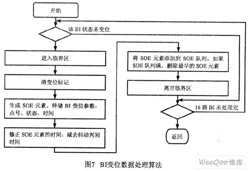 开关量信号采样数据处理任务主要完成将BI定时中断采集服务程序采集到的开关量变位信息转换成SOE记录,并添加到SOE队列之中,处理算法如图7所示。该算法主要实现了两项功能:SOE队列元素的时间修正和SOE队列操作。由于BI中断程序记录的BI变位时间是去抖动判别确认时的时间,因此生成SOE记录时要将该时间修正到BI开始变位的时间。SOE队列操作就是将SOE元素添加到SOE队列之中,在添加SOE元素时,如果队列已满,需要将最早的SOE元素删除,再将新生成的SOE元素添加到队列之中。正常情况下,M板每O.5秒与B通信一次,召唤B板采集生成的开关最信息,根据现场经验,即便开关量变位发生雪崩效应,16路BI在0.5秒之内也不会产生64个SOE记录,软件实现时设置的SOE队列的长度为64。当然,如果发生M板与B板的通信长期中断,SOE队列会有溢出发生,这种情况一般都是装置故障,需要检修予以排除。此外,BI变位信息和ISOE队列的访问操作与其它任务和中服务程序有互斥要求,需要使用临界区加以保护。