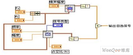 自选信号是信号发生器发出的信号加上噪声信号来实现的。在信号发生器部分应用Basic Function Generator.vi产生正弦波、方波、三角波、锯齿波等标准信号,噪声部分我使用了Uniform. White Noise Waveform.vi生成均匀分布的伪随机的白噪声,然后一起相加生成自选信号。