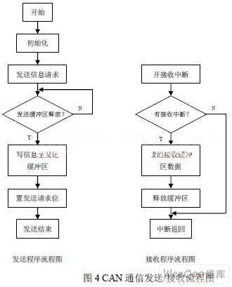 由主控流程图可以看出,软件设计的关键在于采集速度、张紧力的值和发送控制信号,所以,基于CAN的通信至关重要。 CAN通信系统的软件设计包括系统初始化、发送程序、接收程序。在完成对所有报文对象初始化后,程序进入发送/接收阶段。CAN报文的发送是个自动过程,由CAN控制器自动完成。用户只需要根据接收到的远程帧的识别符,将对应的数据转移到发送缓冲寄存器,然后将此报文对象的编码命令请求寄存器启动发送即可。发送程序结构如图4所示。